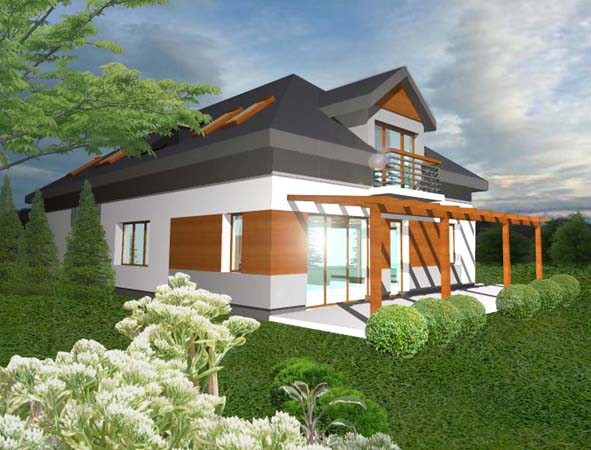 Przedmiotem inwestycji jest budowa domu jednorodzinnego o łącznej powierzchni użytkowej piwnicy, parteru oraz poddasza 405,87m 2 . >>> Projekt kocnepcyjny
