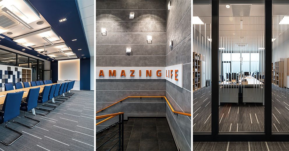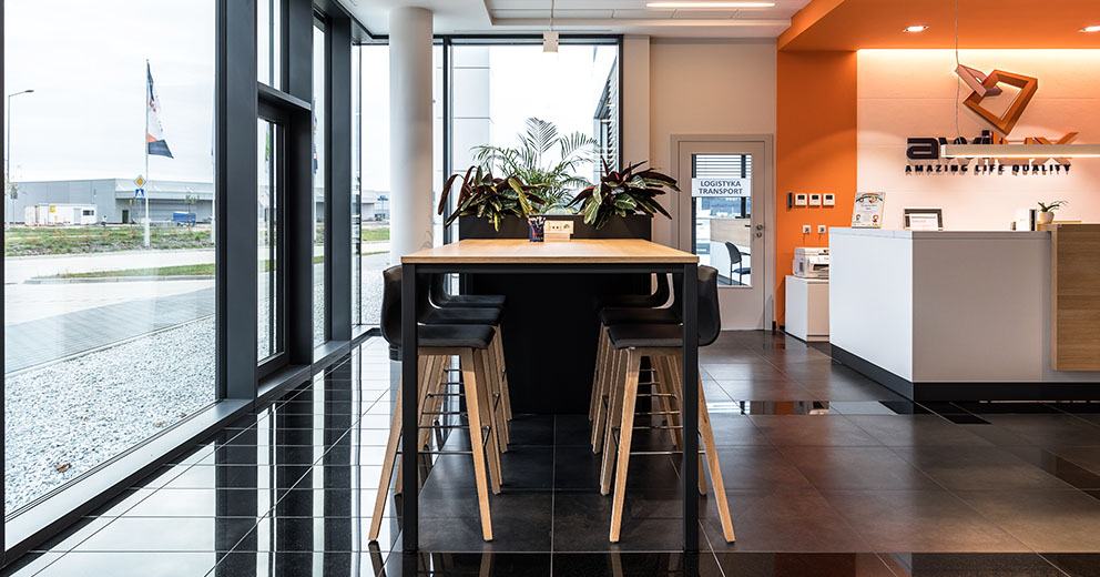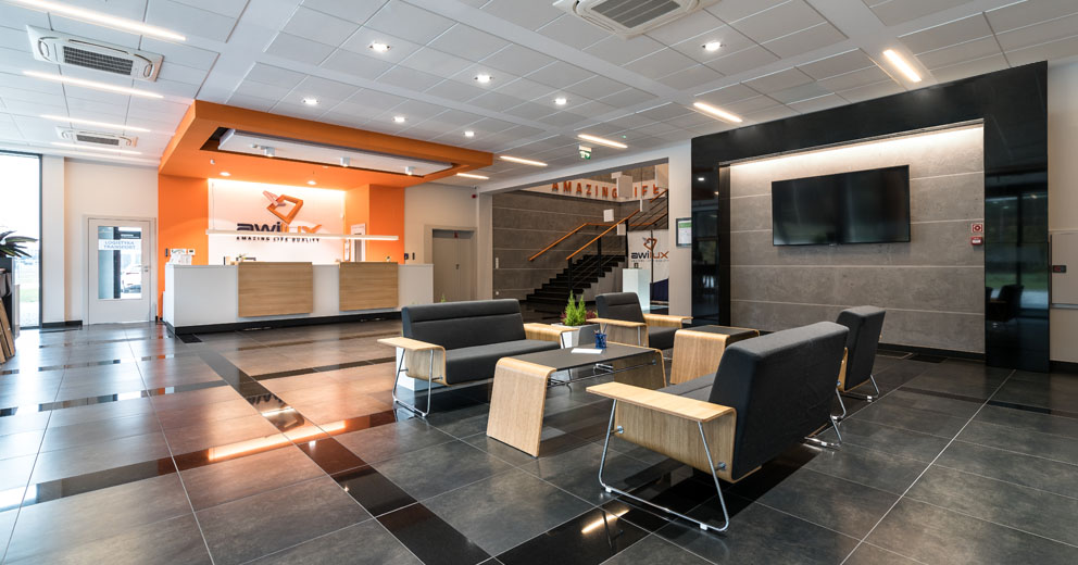 Projekt architektury wnętrz budynku biurowego dla firmy AWILUX, w Lesznie, na ulicy Budowlanych/Geodetów. Powierzchnia użytkowa: 1654,58 m2